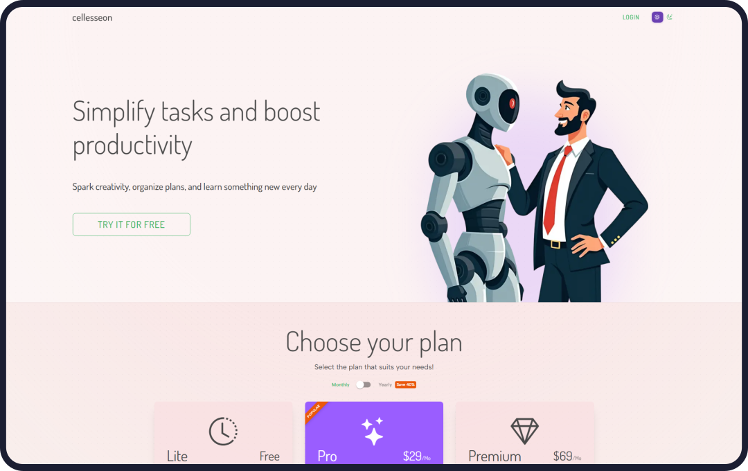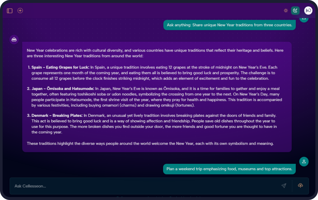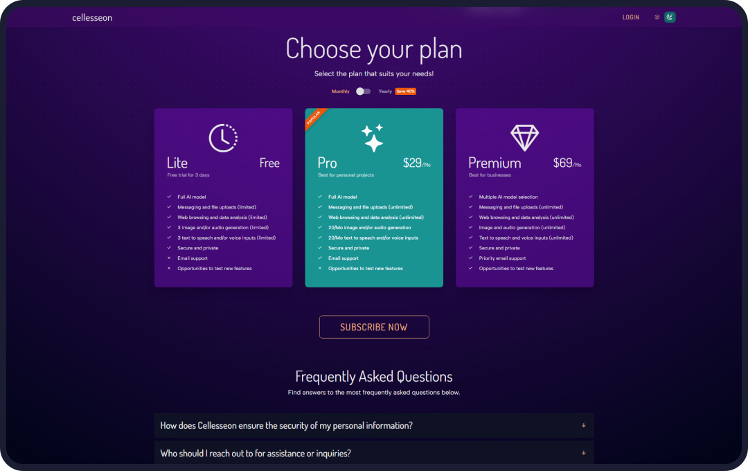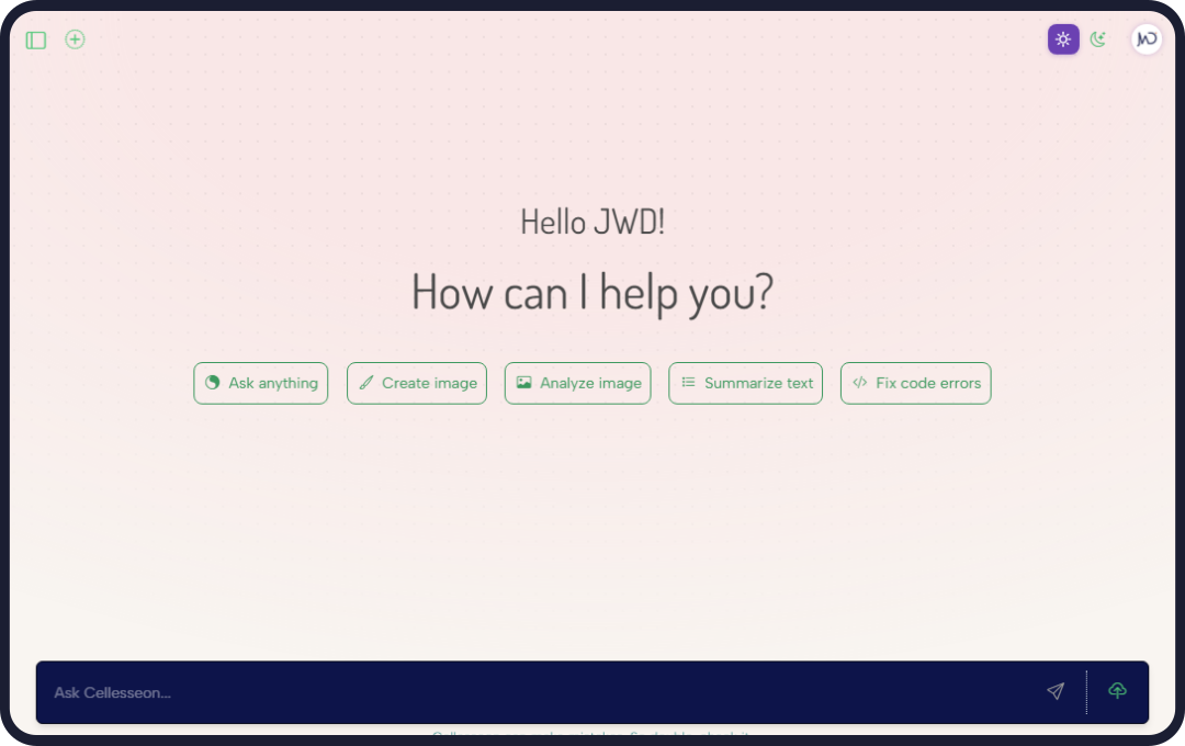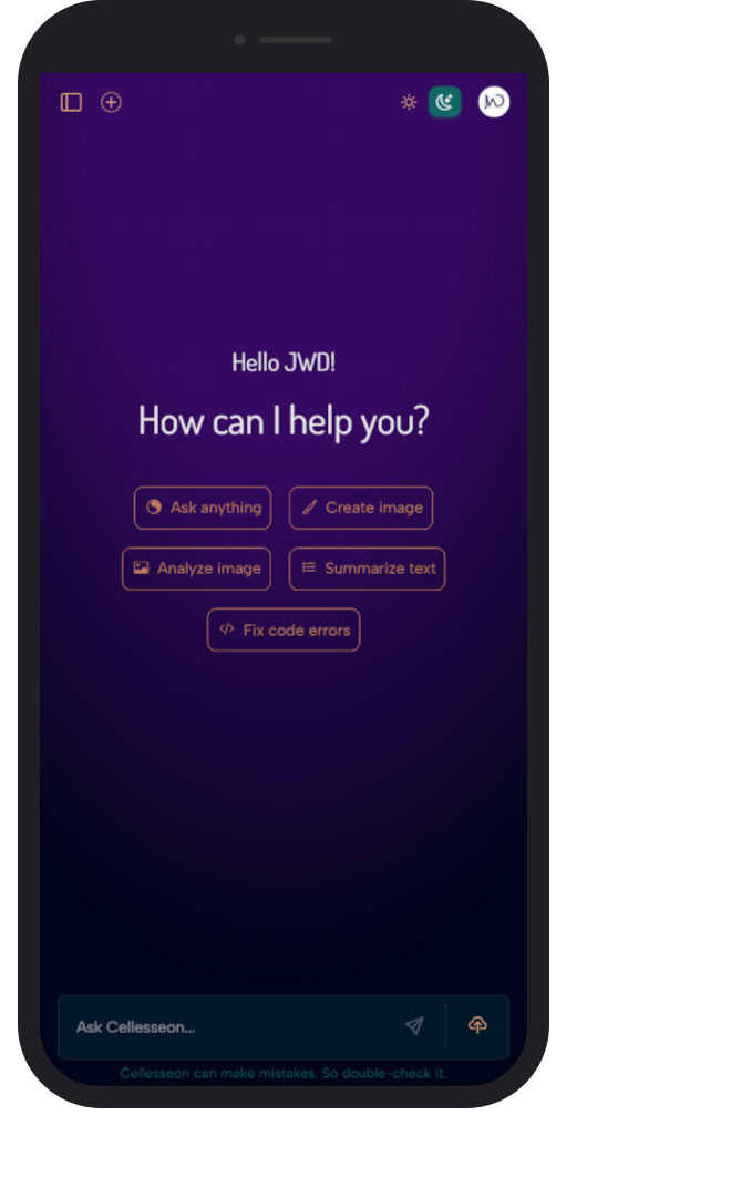 Cellesseon is a subscription-based AI platform that goes beyond simple chat. It empowers users to generate images, produce audio, upload and analyze files, and hold rich multi-turn conversations – all within a single, polished interface. The experience adapts seamlessly across devices and themes, with every interaction designed to feel immediate and intuitive.